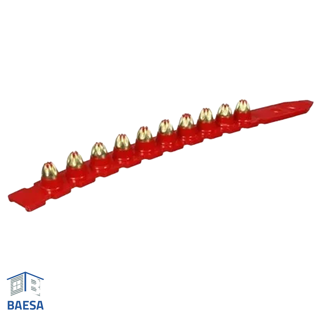 Los fulminantes rojos se utilizan como cargas de mayor intensidad en herramientas de fijación. Están diseñados para trabajos que requieren perforar materiales de alta densidad, asegurando un anclaje firme y duradero.